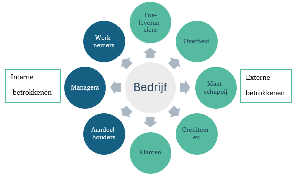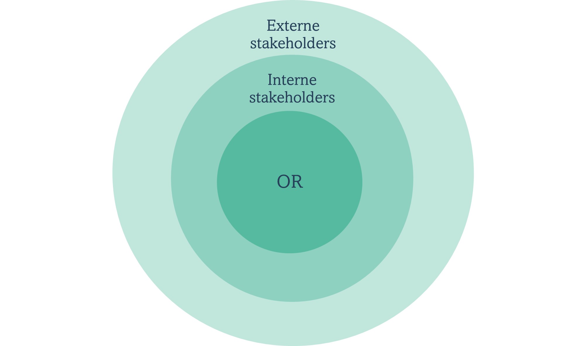 Bij het maken van deze tekening kun je meteen onderscheid maken tussen de stakeholders die direct invloed hebben op de aanpak en resultaat. Ook kun je onderscheid maken tussen interne, externe of interface stakeholders. Zo kun je inzichtelijk maken voor alle OR-leden wat de relatie is tussen de stakeholder en de adviesvraag en/of organisatie.